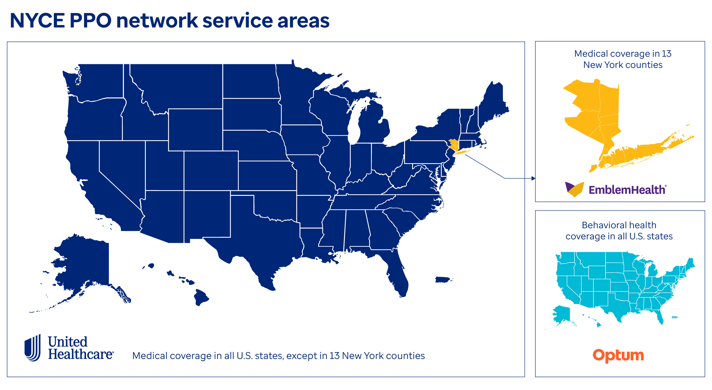 • Optum Behavioral Health – Provider reimbursement rates apply for covered behavioral health services provided throughout the U.S., including the downstate 13 New York counties listed above